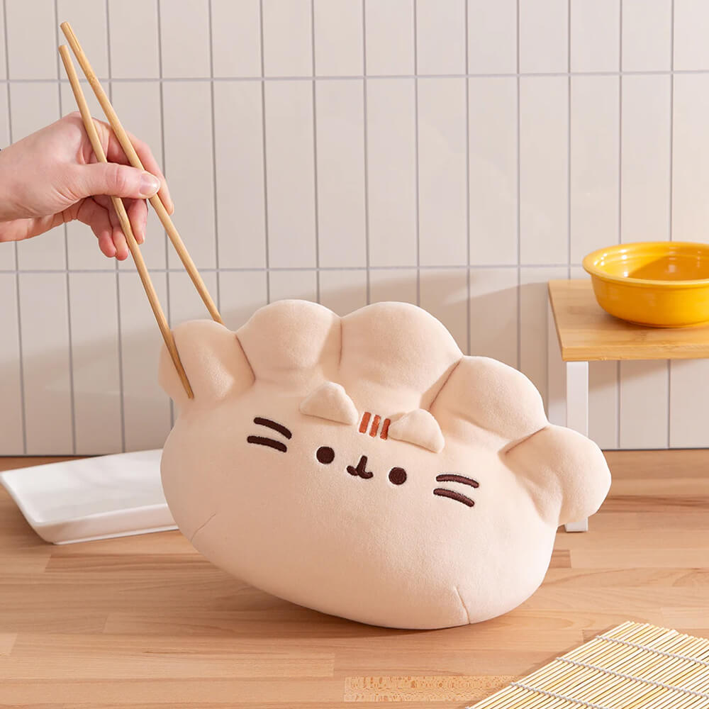 Indulge in a tasty snack as Pusheen transforms into some of her favourite Asian delicacies! This extra-large gyoza plush shows the lovable tabby as a squishy, delightfully plump dumpling. Pusheen's adorable face is adorned with deep brown embroidery and embroidered creases at the top. Give her a hug - this Squisheen is made from premium soft plush materials that are extra squishy and oh-so-satisfying to squeeze! Its fun, huggable design make this whimsical piece a must-have for any foodie's collection.
